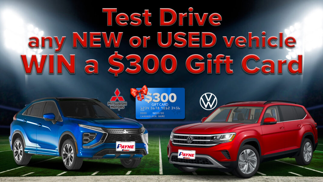 That’s right! Come on by and test drive any volkswagen mitsubishi or used car for an entry to win a $300 dollars gift card from now till October 30!